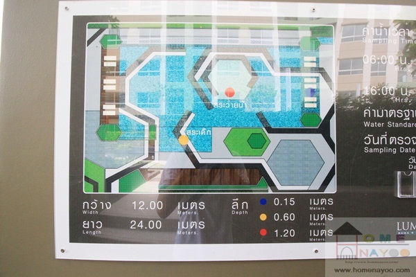 ขนาดสระว่ายน้ำ กว้าง 12 เมตร ยาว 24 เมตร ลึก 1.20 เมตร แยกสระเด็กลึก 0.60 เมตร