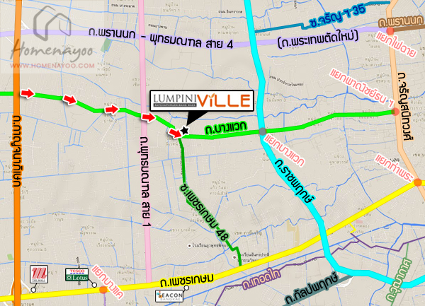จาก ถ.เพชรเกษม > ซ.เพชรเกษม 48 > ถ.บางแวก >—3.2 กม.—> ลุมพินี วิลล์ ราชพฤกษ์ – บางแวก