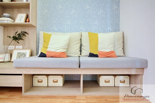 มุมนั่งเล่น-พักผ่อน Built-in โซฟา ขนาด 2 ที่นั่ง พร้อมช่องสำหรับเก็บของด้านล่าง ติดกันบิวท์อินโต๊ะทำงาน (ความกว้างจากโซฟา – โต๊ะทำงาน 2.3 เมตร พอดีผนัง) ผนังด้านบนติดตู้เก็บของ และชั้นวางของ วัสดุเฟอร์นิเจอร์เป็นพาร์ติเคิลปิดผิวทั้งหมดค่ะ