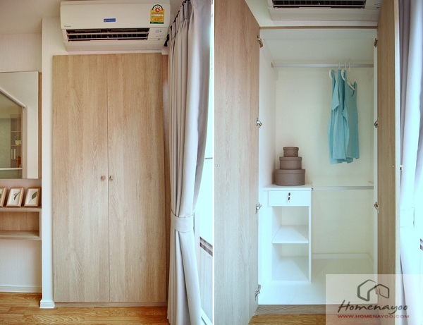 ตู้เสื้อผ้าบานเปิด ผิวพาร์ติเคิลบอร์ด มือจับลูกตุ้ม กว้าง 1.15 เมตร เปิดออกด้านในเว้นเป็นราวแขวนผ้า บน-ล่าง มีลิ้นชัก และชั้นวางของขนาดเล็กไว้เก็บถุงเท้า ชุดชั้นใน