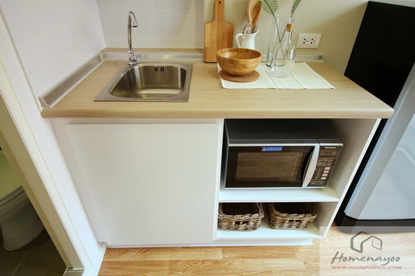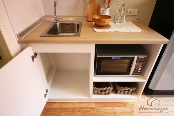 ด้านล่างใต้ซิงค์ล้างจาน เป็นตู้เก็บของบานเปิด เอาไว้เก็บพวกอุปกรณ์ทำความสะอาดบ้าน หรือจะวางถังขยะซ่อนไว้ด้านใน ติดกันแบ่งช่องสำหรับวางไมโครเวฟ มีเต้าเสียบปลั๊กไฟด้านหลังให้ ชั้นล่างสุดก็วางของใช้เล็กๆ น้อยๆ ได้ค่ะ