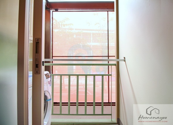 ระเบียงขนาดกำลังดี กั้นราวระเบียงเหล็กทาสีน้ำมัน สูงประมาณ 1 เมตร พร้อมติดตั้งราวตากผ้าอลูมิเนียม ไว้ให้พร้อมใช้งาน เพดานติดโคมไฟซาลาเปาให้ 1 ดวง