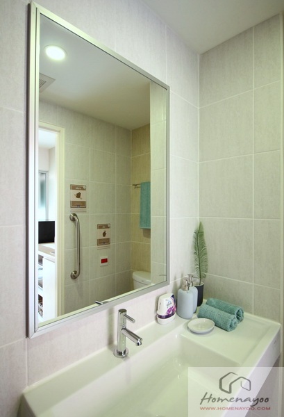 ออกมาจากห้องนอน เลี้ยวขวา > ไปต่อกันที่ส่วนด้านใน โครงการออกแบบห้องชุด โดยแยกฟังก์ชั่นการใช้งานเป็นสัดส่วน แบ่งเป็นห้องน้ำ, มุมเตรียมอาหาร, มุมทานอาหารเล็กๆ และระเบียงสำหรับซักล้างค่ะ