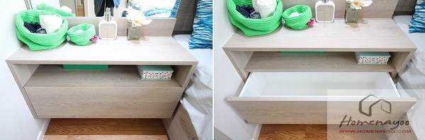 โต๊ะเครื่องแป้ง ถูกแบ่งเป็นชั้นวางของ และกล่องลิ้นชัก ผนังขวามือติดตั้งปลั๊กไฟไว้สำหรับเสียบไดร์เป่าผม หรือชาร์ตแบตฯโทรศัพท์ให้พร้อมใช้