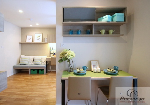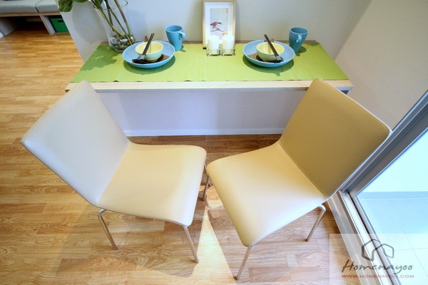 ตรงข้ามบิวท์อินโต๊ะทานข้าวเข้ามุม หน้าบานไม้พาร์ติเคิลบอร์ด ขนาด 1.1 x 0.5 เมตร ให้พร้อมเก้าอี้ 2 ตัว นั่งทาน 2 คน ได้กำลังดี ด้านบนติดชั้นวางของ ไม่มีบานปิด แบ่งไว้สองช่อง ไว้วางของใช้เล็กๆ น้อยๆ