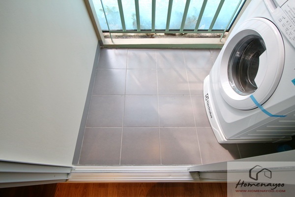 สามารถวางเครื่องซักผ้า ได้ทั้งแบบฝาหน้า และฝาบน มีการต่อระบบท่อน้ำดี และท่อน้ำทิ้ง รวมถึงปลั๊กไฟให้พร้อมใช้งาน มีท่อระบายน้ำทิ้งด้านล่าง และราวตากผ้าให้ด้วยเช่นเดียวกัน