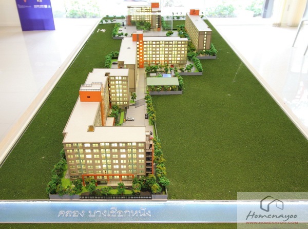 – การออกแบบโครงการและวัสดุ : สำหรับโครงการนี้ เป็นคอนโด Low-Rise 8 ชั้น ตั้งอยู่บนที่ดินประมาณ 11 ไร่เศษ มีทั้งหมด 5 อาคาร แบ่งเป็นอาคาร A, B, C, D และ E อาคารออกแบบสไตล์ LPN ดูเรียบๆ ใช้โทนสีเทา-ขาว ตัดขอบอาคารด้วยสีส้มและเขียว โดยโครงการเลือกใช้โทนสีที่ยังดูทันสมัย สมวัยกับคนทำงาน โดยห้องพักจะมีขนาดหลักๆ อยู่ 2 แบบ คือ ห้องชุด ขนาด 22.50 และห้องชุด ขนาด 26.00 ตร.ม. จะมีห้องชุดขนาด 23.00, 26.50 แทรกอยู่บ้างเล็กน้อย โดยห้องพักจะเริ่มต้นที่ชั้น 2 เหมือนกันทุกอาคาร