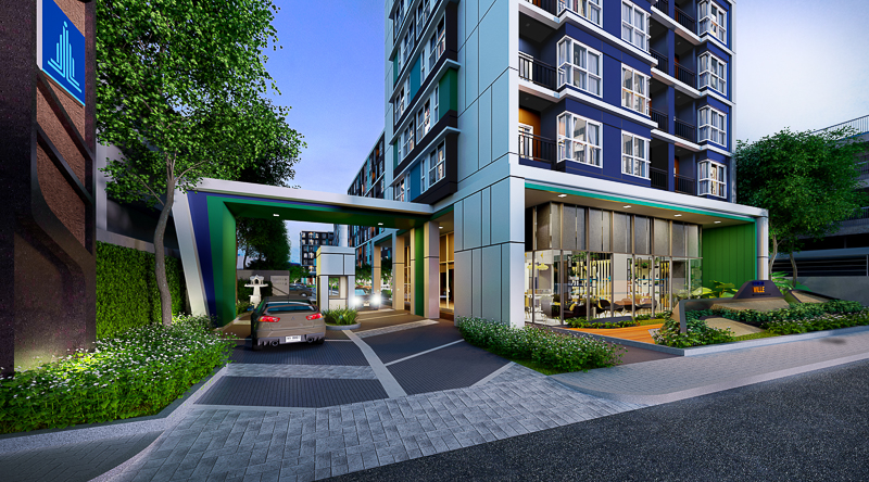 การออกแบบโครงการและวัสดุ – โครงการออกแบบมา 2 อาคาร สูง 8 ชั้น บนพื้นที่ดินขนาด 3-0-20 ไร่ อาคารรูปทรงสี่เหลี่ยมตัว L เรียบๆ สีภายนอกใช้โทนน้ำเงิน ฟ้า และเทา ตัดด้วยสีส้มอิฐ ชั้นพักอาศัยจะเริ่มที่ชั้น 2-8 Facility หลักๆจะอยู่ที่ชั้น 1 ทั้งหมด
