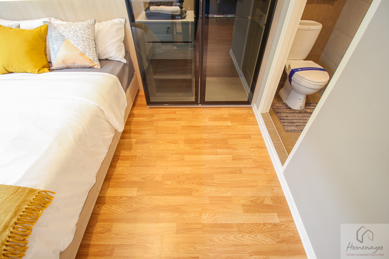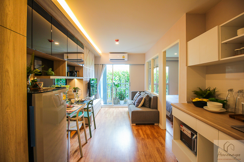 เดินเข้าห้องมาจะเจอส่วนครัวก่อน ฝั่งซ้ายมีพื้นที่ให้วางตู้เย็น และโต๊ะรับประทานอาหาร ด้านในจะเป็นส่วนห้องนั่งเล่นอยู่ติดกับระเบียง ขวามือจะเป็นห้องนอน พื้นห้องเป็นไม้ลามิเนตหนา 8 มม. ฝ้าสูง 2.4 ม. ผนังได้ฉาบเรียบทาสีขาวทั้งห้อง