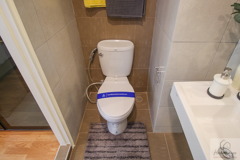 ฝั่งนี้วางโถสุขภัณฑ์ของ American Standard พร้อมสายชำระ