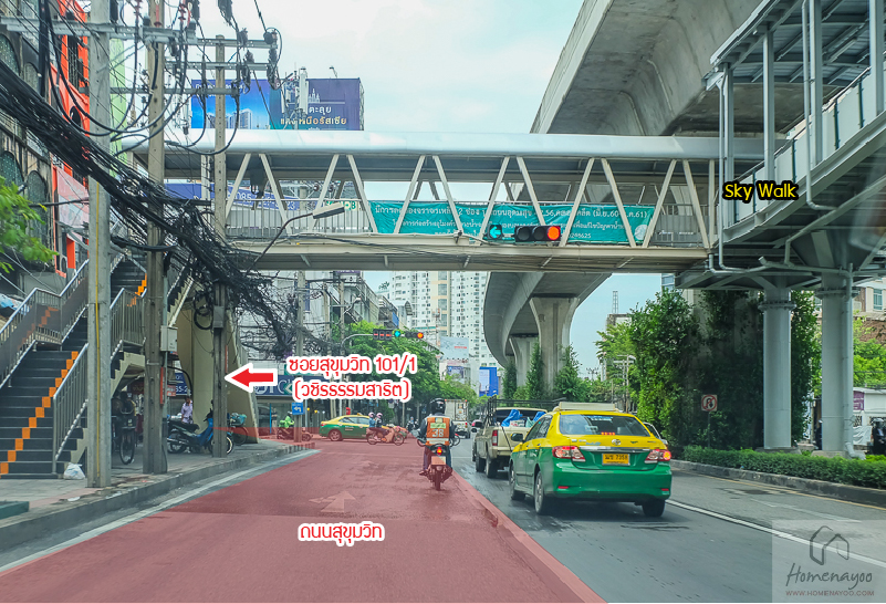 ถัดมาจะเจอแยกไฟแดง ให้เลี้ยวซ้ายเข้าซอยสุขุมวิท 101/1 หรือถนนวชิรธรรมสาธิต สังเกตตัว Sky Walk จะยาวมาถึงแยกนี้เลย