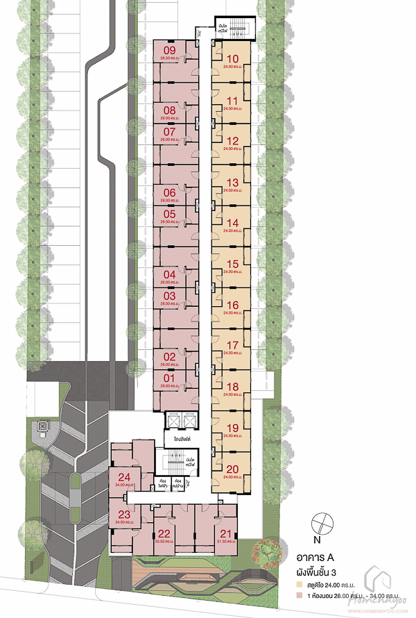แปลนอาคาร A ชั้น 3-8 จะเหมือนกันทุกชั้นครับ เป็นชั้นพักอาศัยทั้งหมด ชั้นละ 24 ยูนิต ที่ตำแหน่ง 10-20 จะเป็นห้องแบบ Studio ขนาด 24.00 ตร.ม. จำนวน 11 ยูนิต และที่ตำแหน่ง 1-9 , 21-24 จะเป็นห้องแบบ 1 Bedroom ขนาด 28.00 – 34.00 ตร.ม. จำนวน 13 ยูนิต