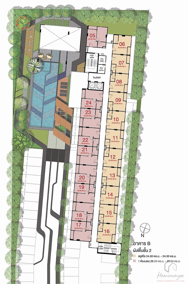 แปลนอาคาร B ชั้น 2 จะเริ่มเป็นชั้นพักอาศัยมีทั้งหมด 20 ยูนิต ที่ตำแหน่ง 06-16 จะเป็นห้องแบบ Studio ขนาด 24.00 – 24.50 จำนวน 11 ยูนิต และที่ตำแหน่ง 05, 17-24 จะเป็นห้องแบบ 1 Bedroom ขนาด 28.00 – 28.50 ตร.ม.