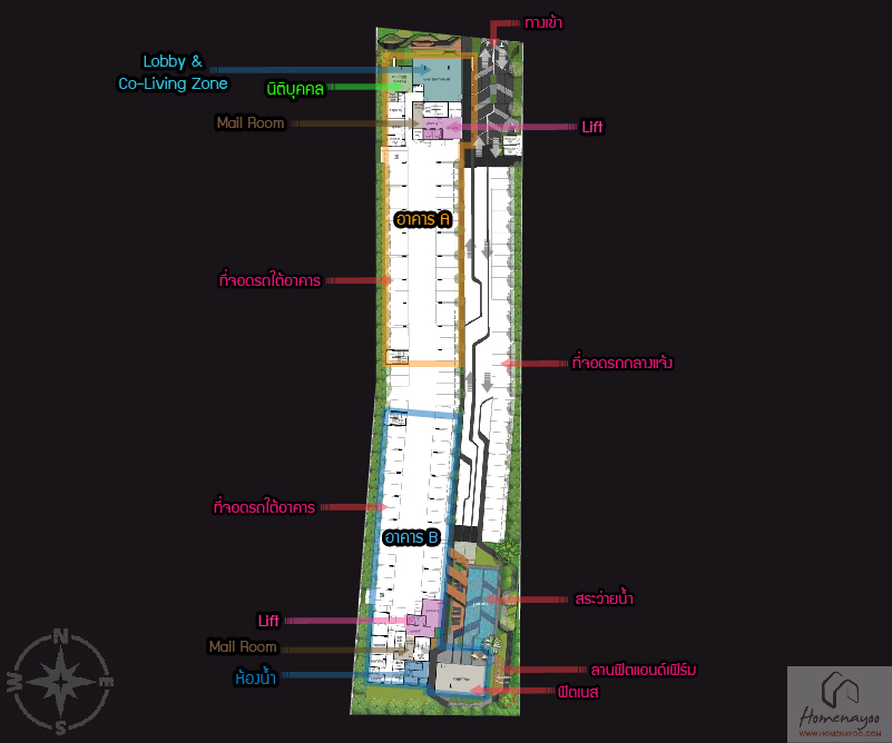 Master Plan โครงการเริ่มจากด้านหน้าทางเข้าติดกับซอยสุขุมวิท 101/1 ผ่านเข้ามาจะเจอป้อมยามมีไม้กระดก ผ่านเข้ามาจะเป็นส่วนของอาคาร A ด้านในพื้นที่โครงการจะเป็นอาคาร B ที่จอดรถจะมีแบบจอดกลางแจ้ง และจอดใต้อาคาร ทั้งโครงการจอดได้ 106 คัน หรือคิดเป็น 32% ไม่รวมซ้อนคัน ตรงอาคาร A ที่ชั้น 1 จะเป็นส่วน Lobby & Co-Living Zone ติดกันเป็นห้องนิติบุคคล และห้อง Mail Room มีลิฟต์โดยสาร 2 ตัว ที่อาคาร B จะมี Lobby แยกส่วน Mail Room มีลิฟต์โดยสาร 2 ตัว ฝั่งทิศตะวันออกจะมีห้องฟิตเนส สระว่ายน้ำกลางแจ้ง และลานฟิตแอนด์เฟิร์ม