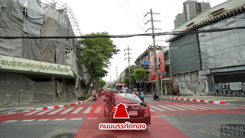 ด้านหน้าจะมีทางม้าลายให้ข้ามไปฝั่งตรงข้ามได้ โดยทางม้าลายเค้าจะทำไว้เป็นระยะ ๆ ตลอดเส้นบรรทัดทองเลยค่ะ