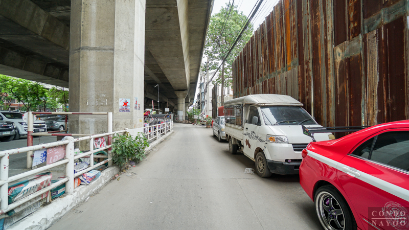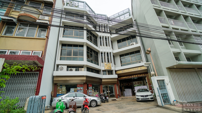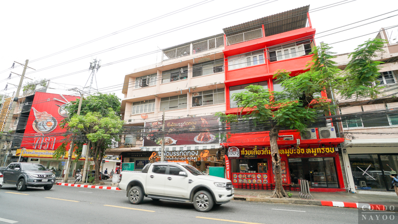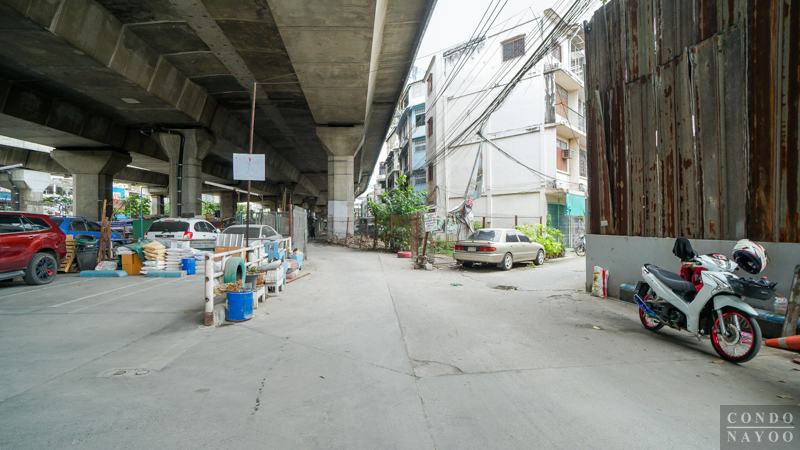 ตรงข้ามจะเป็นที่จอดรถให้เช่า ส่วนด้านหลังจะเป็นซอยรอง และกลุ่มที่อยู่อาศัยแนวราบทั้งหมด