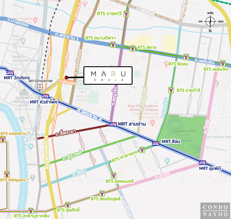 ทำเลที่ตั้งโครงการ MARU จุฬา อยู่บนถนนเจริญเมือง ใกล้แยกวัดดวงแขและถนนจารุเมือง เพียง 60 ม* อีกด้านจะใกล้กับแยกสะพานอ่อนและถนนบรรทัดทอง เพียง 200 ม.* และเป็นคอนโดที่อยู่ใกล้กับจุฬาลงกรณ์มหาวิทยาลัย เพียงแค่ 700 ม.* ทำให้เดินทางไป-กลับมหาวิทยาลัยได้ใกล้ ๆ