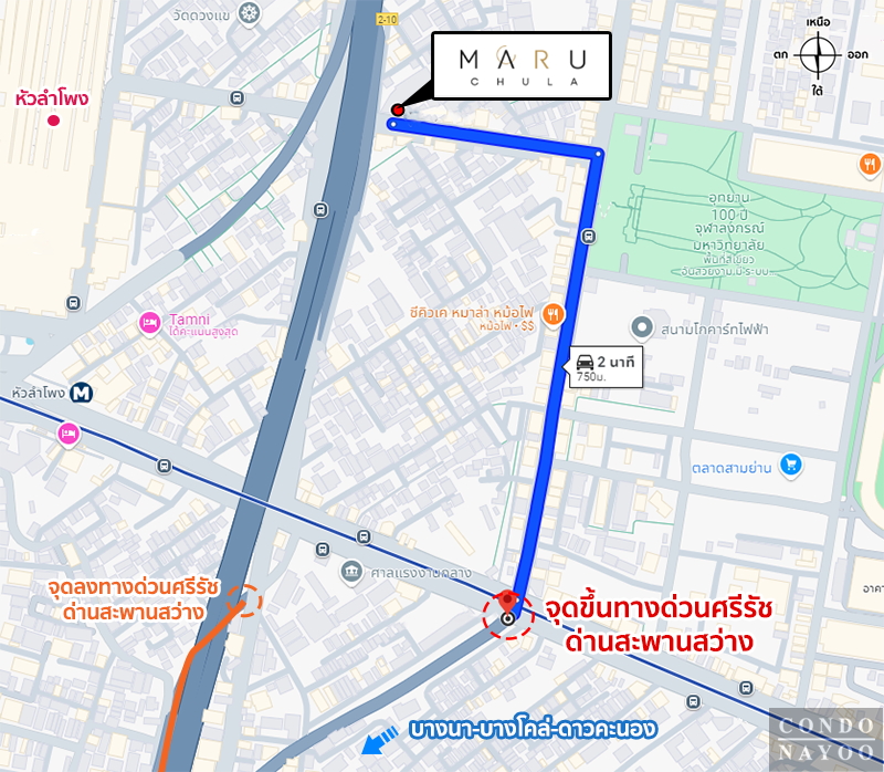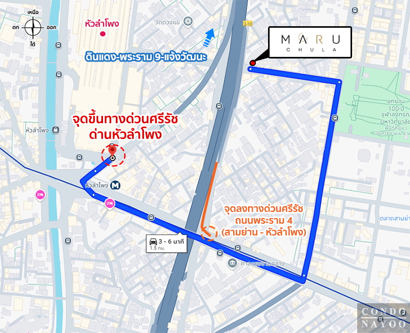 อีกด่านเป็นทางด่วนศรีรัช ด่านหัวลำโพง ระยะทางประมาณ 1.5 กม.* หรือขับรถมาเฉลี่ยพอ ๆ กัน 3-6 นาที* จากโครงการวิ่งออกมาทางถนนบรรทัดทอง หรือจะออกมาทางถนนจารุเมืองก็ได้แล้วแต่สะดวก แล้ววิ่งไปทางพระราม 4 ขาออก เลี้ยวขวาตรงแยกหัวลำโพง ก็จะวิ่งไปขึ้นทางด่วนได้เลยค่ะ