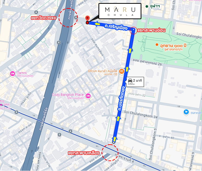 การเดินทางเริ่มจาก : ถนนพระราม 4 ⇒ สะพานไทย-ญี่ปุ่น ⇒ แยกสะพานเหลือง ⇒ ถนนบรรทัดทอง ⇒ แยกสะพานอ่อน ⇒ ถนนเจริญเมือง ⇒ 200 ม.* ⇒ โครงการ MARU จุฬา ตั้งอยู่ทางขวามือ*