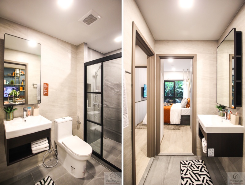 ภายในห้องน้ำแบ่งส่วนเปียกส่วนแห้ง ห้องน้ำมีทางเข้าออก 2 ทางคือ จากตรงห้องนั่งเล่นและจากในห้องนอน
