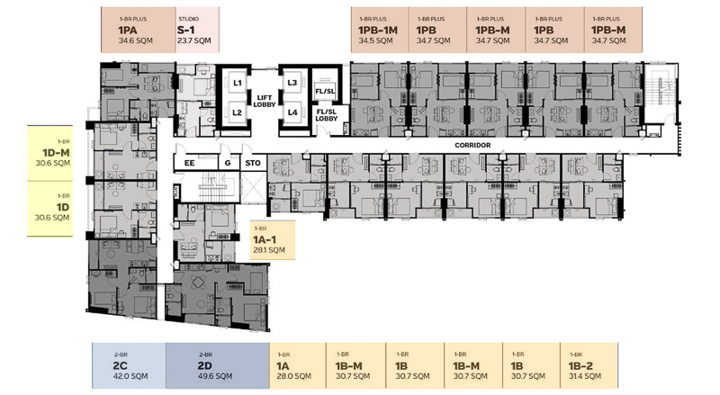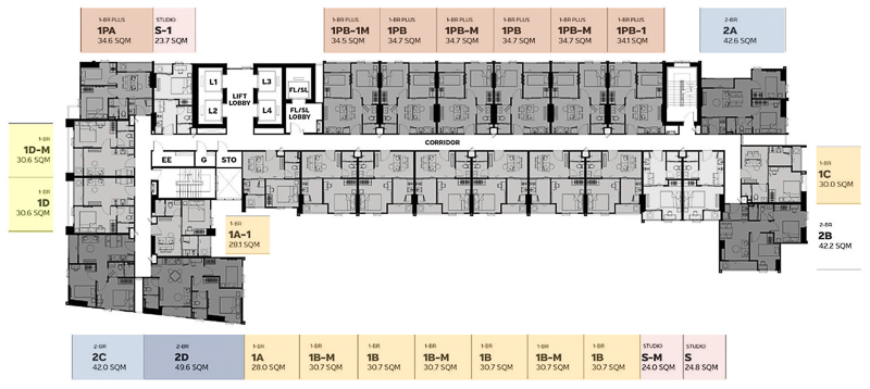 การออกแบบในห้องพักอาศัยที่นี่มีให้เลือกแบบหลักๆคือ Studio ขนาด 23.7-24.8 ตร.ม., 1 Bedroom ขนาด 28-31.8 ตร.ม., 1 Bedroom Plus ขนาด 34.1-34.7 ตร.ม., 2 Bedrooms 1 Bathroom ขนาด 42-42.6 ตร.ม., 2 Bedrooms 2 Bathrooms ขนาด 49.6 ตร.ม.