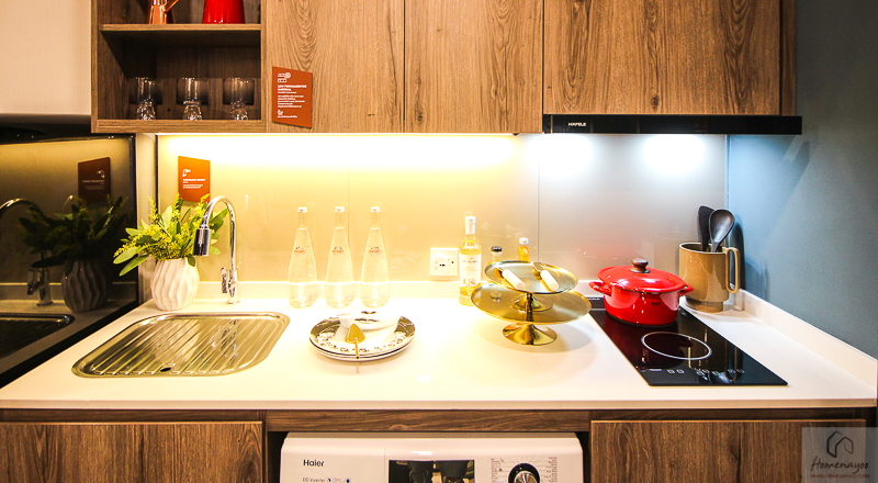 เตาไฟฟ้าพร้อมเครื่องดูดควันของ Hafele และอ่างล้างจานฝังท็อปพร้อมฝาปิดอ่างของ Hafele มีพื้นที่ส่วนเตรียมอาหารมาให้กำลังดี
