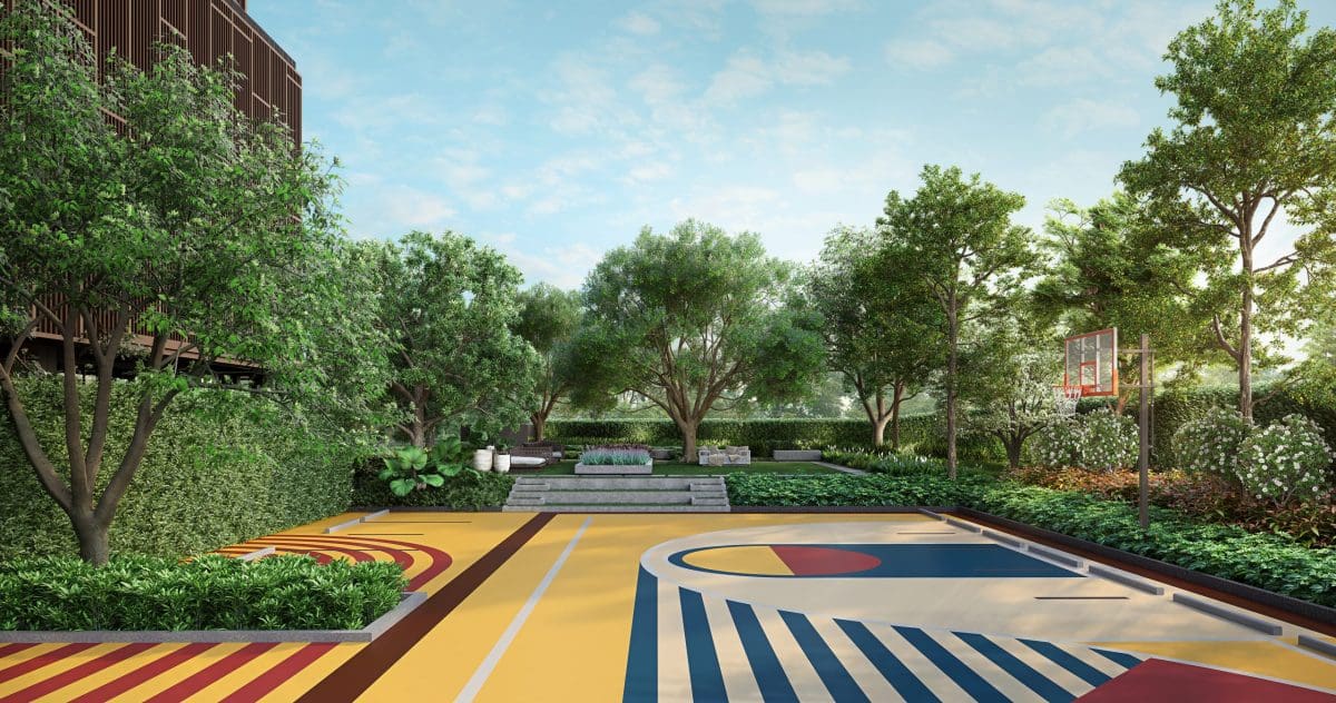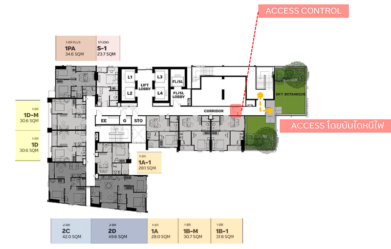 ที่ชั้น 24, 26, 29, 33, 36, 39, 42 เป็นชั้นที่มีสวนเล็กๆบริเวณมุมอาคาร ซึ่งถ้ามองจากภายนอกอาคารจะเป็นเหมือนสวนขั้นบันได ลูกบ้านชั้นอื่นๆสามารถใช้งานได้โดย Access จากบันไดหนีไฟ