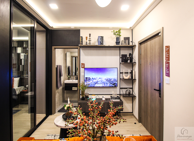 เดินเข้าห้องมาจะเจอส่วนห้องนั่งเล่นและส่วนรับประทานอาหาร ขวามือจะเป็นห้องน้ำ ด้านในจะเป็นห้องนอนและห้องอเนกประสงค์ พื้นห้องจะเป็น SPC หนา 4 มม. ฝ้าเพดานสูง 2.6 ม. ผนังได้ฉาบเรียบทาสี ทุกห้องจะได้ระบบ Home Automation