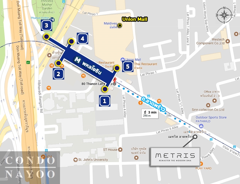 จากหน้าโครงการเดินบนฟุตบาทถนนลาดพร้าวไปเพียง 3 นาทีก็ถึง MRT สถานีพหลโยธินแล้วค่ะ ฝั่งของโครงการจะเป็นทางออกที่ 1 นะ