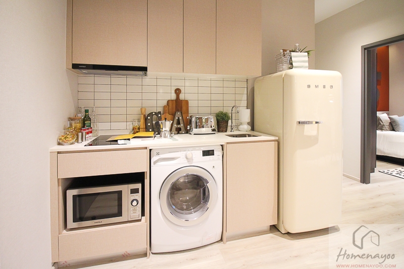 ใต้เคาน์เตอร์ก็มีชั้นวางไมโครเวฟ, ช่องวางเครื่องซักผ้า และมีลิ้นชักให้พอเก็บอุปกรณ์ภายในครัวได้อยู่บ้าง บนเคาน์เตอร์ได้ Top ตามภาพ ติดตั้งเตาเซรามิกและอ่างล้างจานมาให้ เมื่อวางเตาและอ่างล้างจานแล้วก็ยังพอเหลือพื้นที่ในการเตรียมอาหารอยู่บ้าง