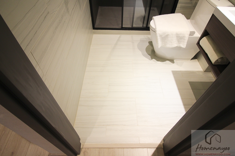 พื้นห้องน้ำปูด้วยกระเบื้องขนาด 30 x 60 ซม. และขนาด 60 x 60 ซม. ลดระดับลงจากพื้นโถงเล็กน้อย