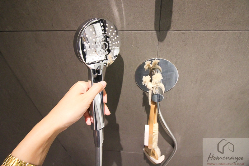 ภายในติดตตั้งชุดฝักบัวสายอ่อนพร้อมราวปรับระดับมาให้ ข้างๆเจาะผนังทำเป็นชั้นวางสบู่ เรียบร้อยดี