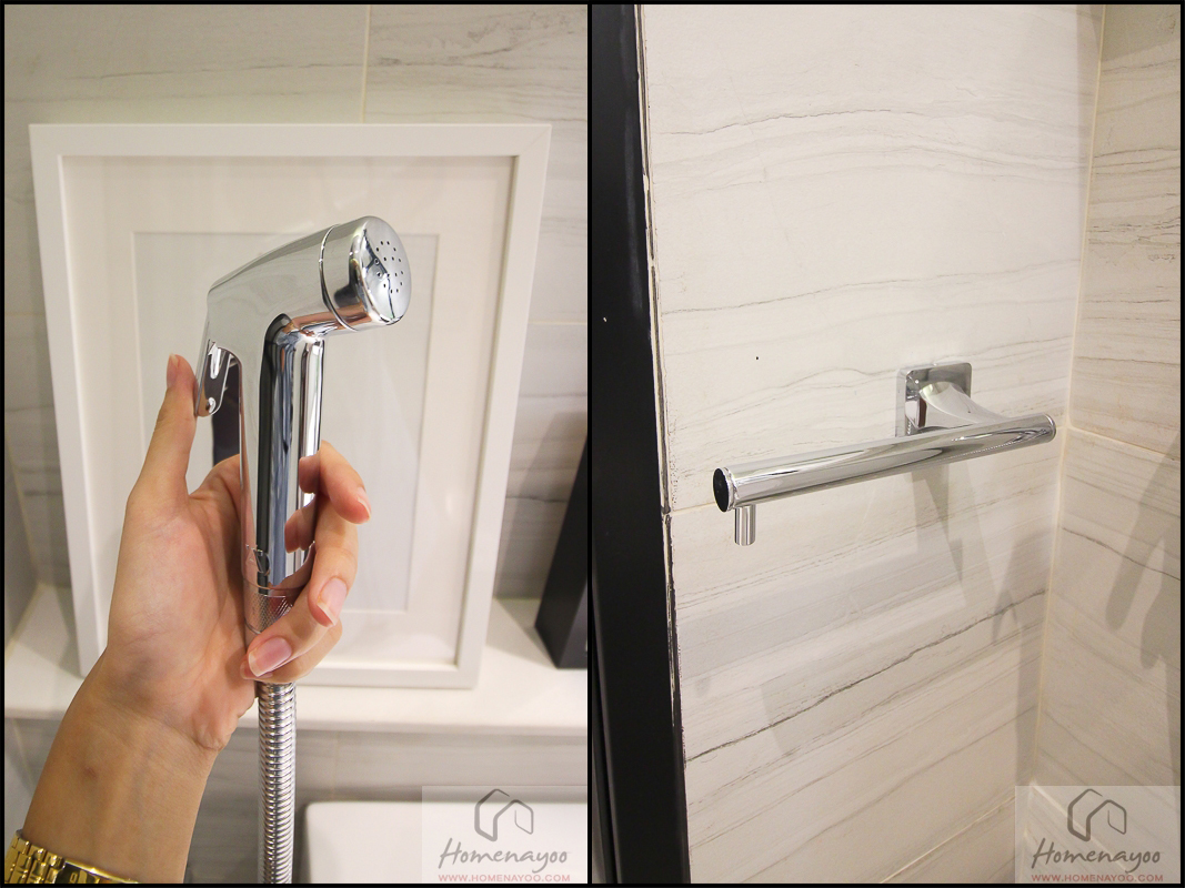 ถัดเข้ามาคือโถสุขภัณฑ์ เป็นระบบ Dual Flush ช่วยประหยัดน้ำ ติดตั้งมาพร้อม Accessories ประกอบการใช้งาน ใช้ของ Hafele เช่นกัน
