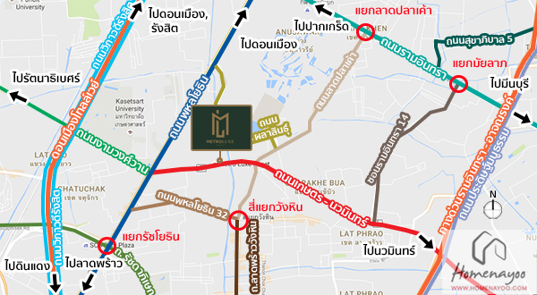 การเดินทางในวันนี้เราจะเริ่มต้นจากแยกรัชโยธิน บนถนนพหลโยธินฝั่งมุ่งหน้าดอนเมือง ตรงมาตามทางเรื่อยๆแล้วเลี้ยวขวาเข้าซอยพหลโยธิน 32 (เสนานิคม 1) ขับตามทางมาเรื่อยๆ เลี้ยวซ้ายเข้าเสนานิคม 1 ซอย 11 ขับตามทางในซอยไปเรื่อยๆจะไปออกถนนเกษตรนวมินทร์ เมื่อออกมาบนถนนเกษตรนวมินทร์แล้วเราต้องไปกลับรถที่แยกเกษตร เพื่อมาวิ่งบนถนนเกษตรนวมินทร์ฝั่งมุ่งหน้านวมินทร์ ตรงมาเรื่อยๆจะเห็นโครงการ Metro Luxe เกษตร อยู่ทางซ้ายมือค่ะ