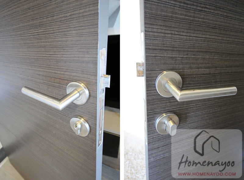 มือจับประตูเป็นเป็นแบบก้านโยกสแตนเลส ด้านนอกมีช่องเสียบรูกุญแจ ด้านในมีตัวบิดหมุนล็อก