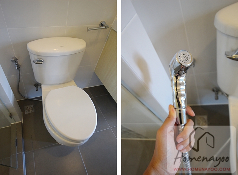 ห้องน้ำทำขนาดมากำลังดีค่ะ แยกส่วนแห้งและส่วนเปียกและมีฉากกั้นห้องน้ำมาให้ ระยะใช้งานกำลังสบายๆไม่อึดอัด พื้นห้องน้ำเป็นกระเบื้องเซรามิกขนาด 30 x 30 เซนติเมตรพื้นห้องน้ำลดระดับลงมาจากพื้นห้องนั่งเล่นลงมาประมาณ 5 เซนติเมตร เพื่อกันความชื้นจากห้องน้ำเข้าสู่ห้องนั่งเล่น