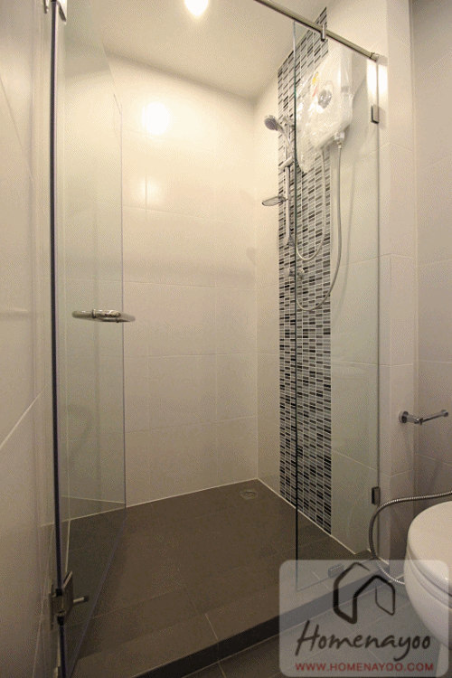 ส่วนอาบน้ำมีฉากกั้นห้องมาให้เป็นกระจกเทมเปอร์เต็มแนวกว้างของผนัง ก่อธรณีขึ้นมาประมาณ 5 ซม. เพื่อกั้นระหว่างพื้นส่วนเปียกส่วนแห้ง มือจับเป็นอลูมิเนียมรูปตัว U ใช้แขวนผ้าเช็ดตัวได้