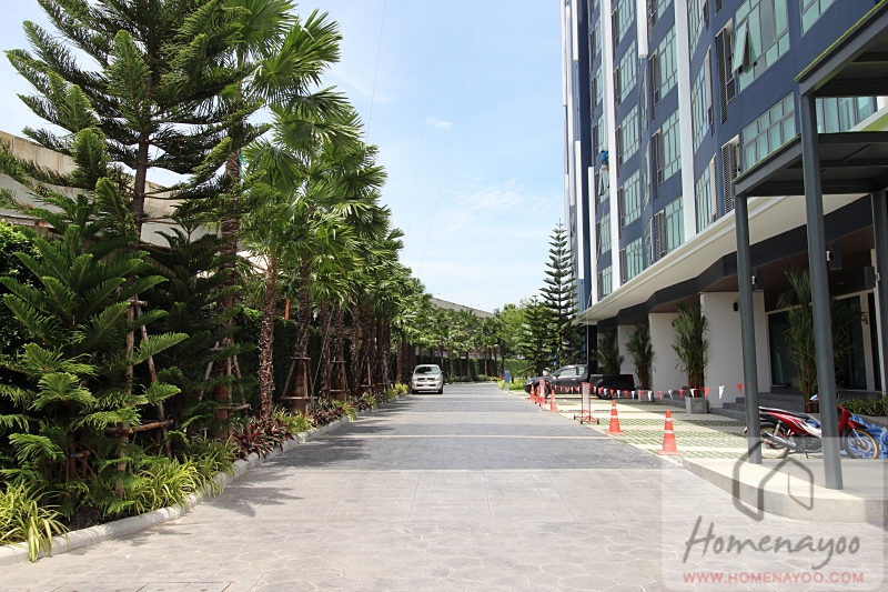 เข้ามาส่วนพื้นติดกับซุ้มทางเข้าออกจะเป็นคอนกรีตสแตมป์นะคะ จะเห็นว่าติดรั้วโครงการปลูกต้นไม้มาเป็นแนว เขียวและร่มรื่นดี รั้วรอบโครงการสูง 2 เมตร คนขับรถตรงเข้ามาเลี้ยวซ้ายตามลูกศรไปที่จอดรถที่อาคาร B ส่วนขวามือของภาพคืออาคาร A อาคารที่อยู่ใกล้ซุ้มทางเข้าออกโครงการมากที่สุด