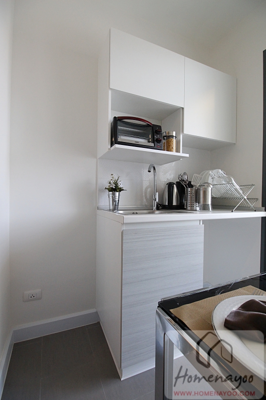 ไปดูส่วนห้องครัวกันต่อค่ะ มีเคาน์เตอร์ครัว Built in มาให้ เป็นเคาเตอร์มีหน้าบานปิดผิวลายไม้ พร้อมชั้นลอยสำหรับเก็บของด้านบนเพิ่ม ของจริงได้ตามนี้ และมีระยะด้านข้างสำหรับวางตู้เย็นได้แบบกำลังดี ผนังส่วนครัวเป็นผนังแต่งกระเบื้องมาให้ทำความสะอาดได้ง่าย เคาน์เตอร์ครัวนี้เหมาะจะใช้อุ่นอาหารและล้างจานมากกว่าค่ะ เพราะจะไม่มีส่วนที่วางเตาไฟมาให้นะคะ