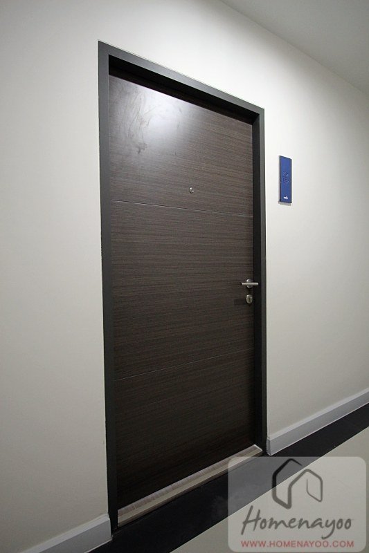 ประตูทางเข้าห้องเป็นประตูบานสำเร็จปิดผิวลายไม้ มีเซาะร่องได้ตามที่เห็นและมีตาแมวไว้ให้ส่องเวลามีคนมาเคาะประตูได้ พร้อมวงกบประตูสีเข้าชุดกัน