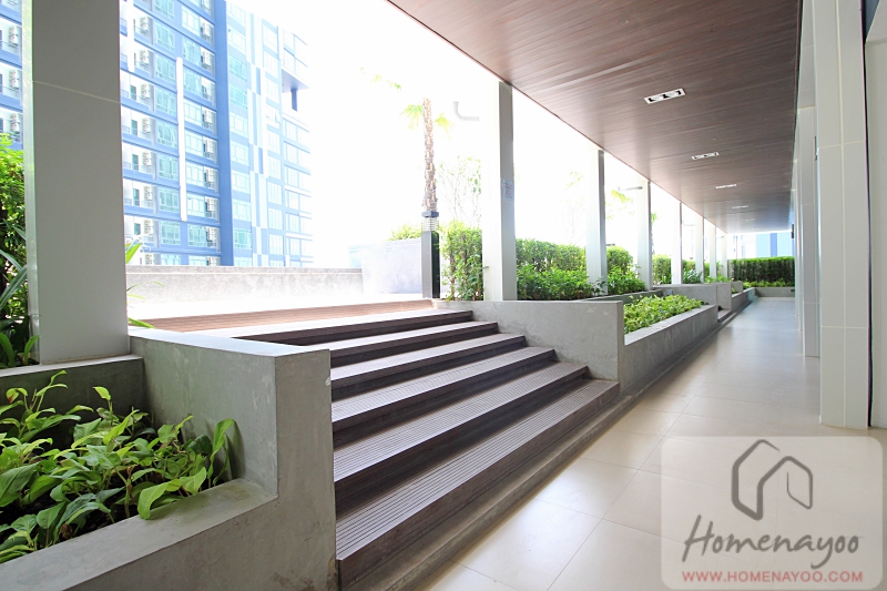หน้าทางเข้าอาคาร B จะมีทางเดินพร้อมหลังคากันแดดกันฝนเชื่อมระหว่าง 3 อาคาร(A, B และ C)มาให้แบบนี้