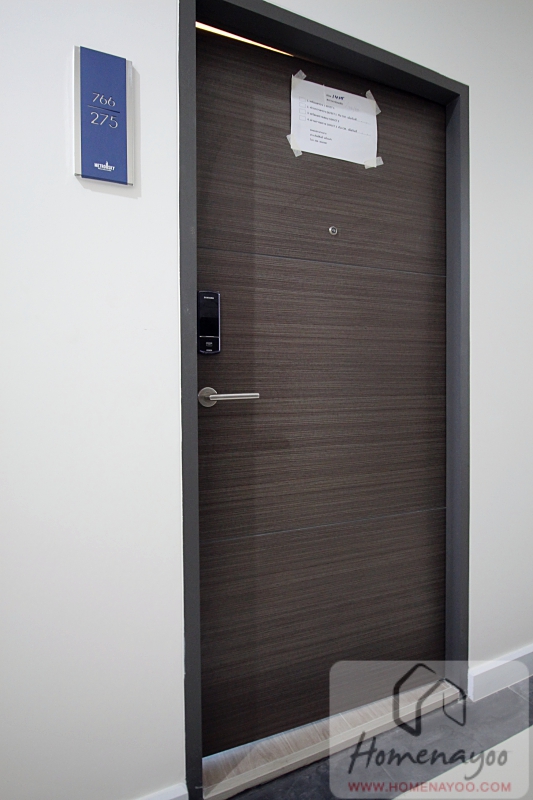 มือจับประตูแบบก้านโยกสแตนเลส และ Digital door lock ของ Samsung ใช้แตะการ์ดหรือกดรหัสเข้ามาได้