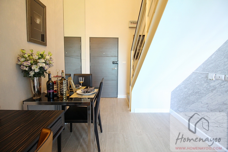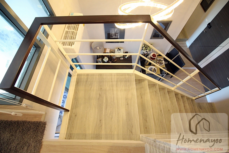 เปิดประตูเข้ามาจะเจอห้องนั่งเล่นเพดานสูง ถัดไปเป็นห้องนอนพร้อมฉากกั้นห้อง ส่วนห้องน้ำอยู่ข้างห้องครัวปิดติดระเบียง และมีบันไดขึ้นไปส่วนห้องนั่งเล่นชั้นบน ตัวห้องขายแบบ Fully Fitted คือมีชุดครัวมาให้พร้อมชุดสุขภัณฑ์และเครื่องปรับอากาศ จะเป็นอย่างไรไปชมกันค่ะ