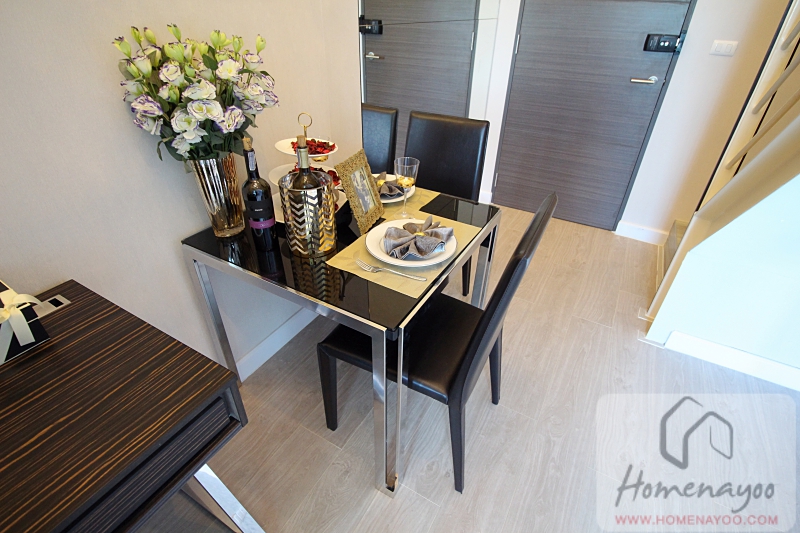 ส่วนทางเข้าห้องตัวอย่างจัดโต๊ะทำงานและโต๊ะรับประทานอาหารมาให้ดูระยะใช้งาน
