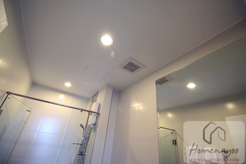 ผนังปูกระเบื้องจรดเพดาน ติดไฟดาวน์ไลท์ และมีพัดลมดูดอากาศมาให้