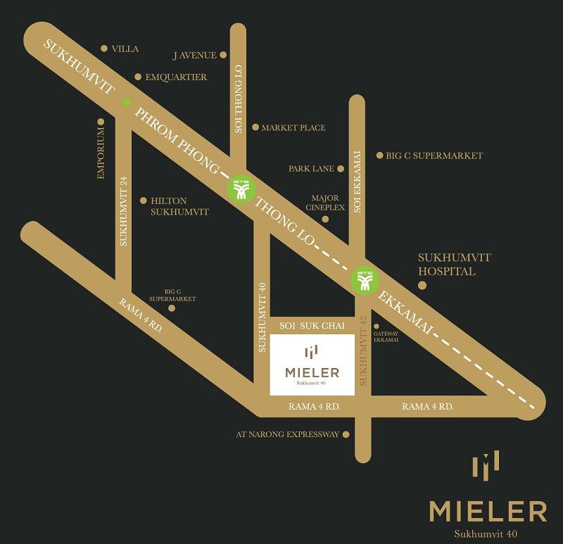 MIELER สุขุมวิท 40 จาก MJ One Group ในเครือ Major Development ตั้งอยู่บนทำเลแยกสุขใจ ซอยสุขุมวิท 40 เดินทางสะดวกสบายเชื่อมต่อ 4 เส้นทาง คือ ถนนสุขุมวิท, ถนนพระราม 4, ซอยสุขุมวิท 40, ซอยสุขุมวิท 42 ใกล้สถานีรถไฟฟ้า BTS เอกมัย ใกล้จุดขึ้นลงทางด่วน อาจณรงค์ (กล้วยน้ำไท)