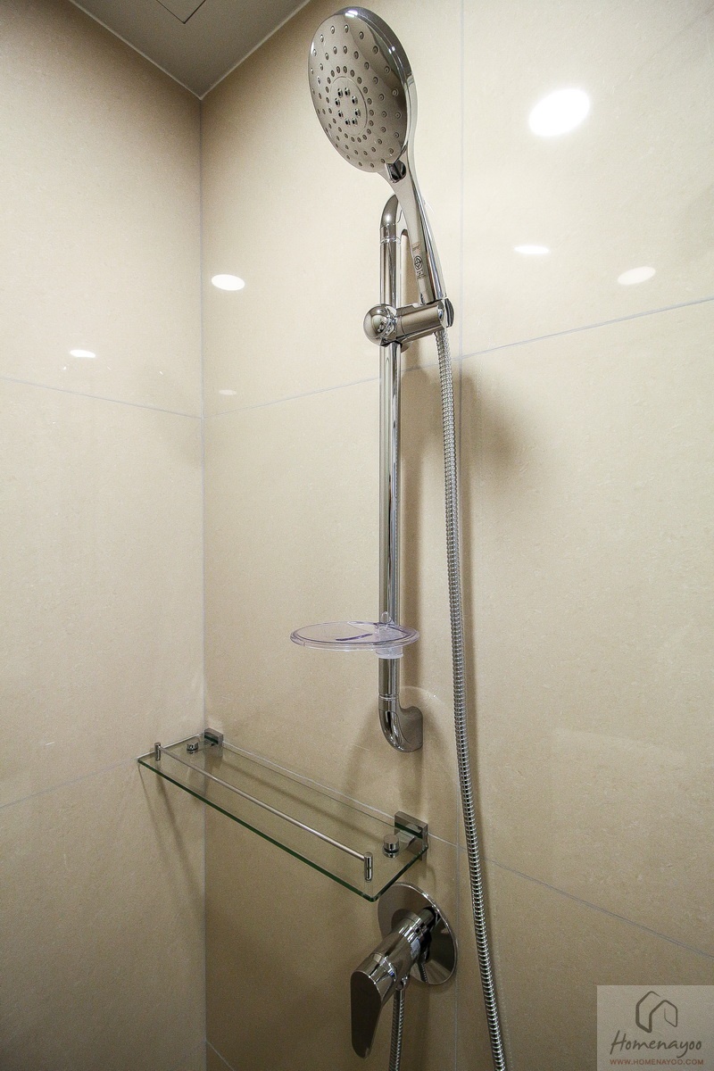 ด้านในติดตั้งฝักบัว Hand Shower หัวกลม ปรับระดับน้ำได้ พร้อมราวปรับระดับสูง-ต่ำ + ที่วางสบู่ ก๊อกน้ำโครเมียมก้านโยก ผนังเหนือหัวก๊อก ติดชั้นวางของกระจกนิรภัยมาให้ 1 ชิ้น