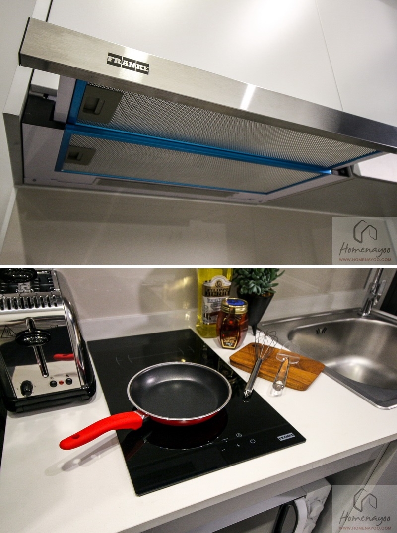 หน้าท็อปครัวติดตั้งเตาไฟฟ้า 2 หัว ปุ่มควบคุมแบบสัมผัส และ เครื่องดูดควันสลิมไลน์ แบบต่อท่อออก (Duct-Out) ของ Franke ที่สามารถดูดกลิ่น ควัน และถ่ายเทอากาศได้ดีกว่าแบบหมุนเวียน รวมถึงง่ายต่อการดูแลรักษา ทำความสะอาด เพราะสามารถถอดตัวตะแกรงกรองควันออกมาทำความสะอาดได้ ไม่เหมือนระบบหมุนเวียน ที่ต้องเปลี่ยนตัวฟิลเตอร์ทุก ๆ 3-6 เดือน