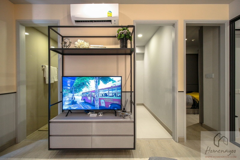 ตรงข้ามโซฟาโครงการบิวท์อินตู้เก็บรองเท้า และ ตู้วางทีวีขนาดมาตรฐานมาให้แบบในภาพ รองรับการวางทีวีขนาด 32-52 นิ้ว ได้ ผนังด้านบนติดเครื่องปรับอากาศ Wall Type 9,000 BTU มาให้ 1 เครื่อง
