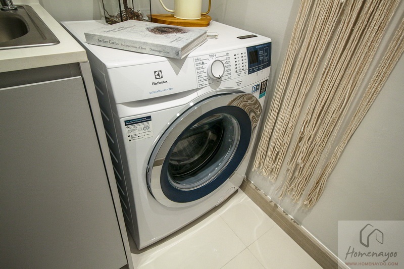 ติดกับเคาน์เตอร์ครัวฝั่งขวาที่อยู่ด้านในสุดของห้อง จะเป็นพื้นที่สำหรับวางเครื่องซักผ้า โดย Type นี้จะรองรับเครื่องซักผ้าได้ทั้งแบบฝาหน้า และ ฝาบน ด้านหลังเดินงานระบบไฟฟ้า ระบบประปามาให้เรียบร้อย พร้อมต่อใช้งาน
